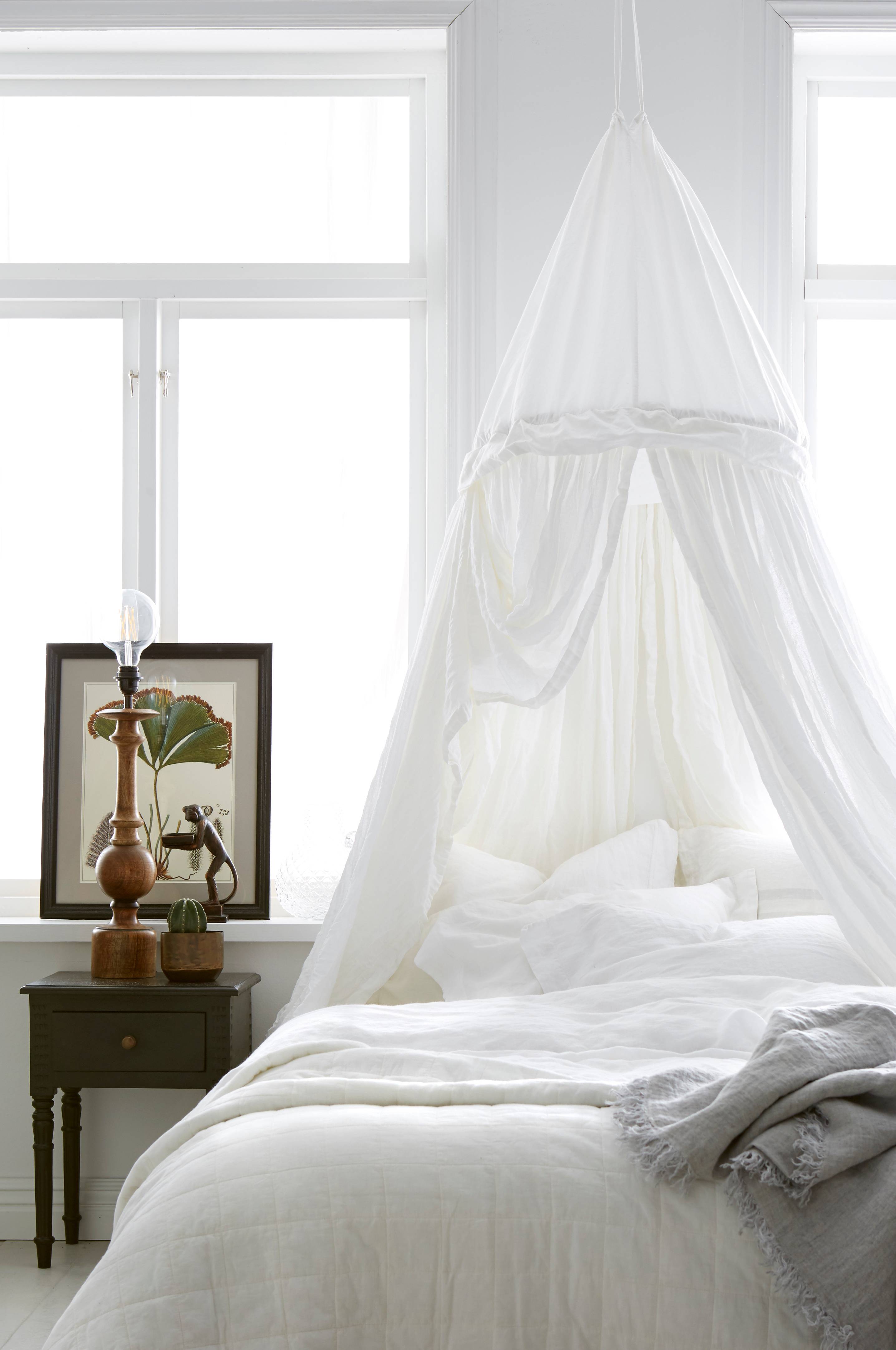 Bäddtillbehör från Ellos Home. Sänghimmel i vitt, skirt, transparent bomullstyg. Fyrkantig modell med band i varje hörn som du använder för att fästa sänghimmeln i taket.